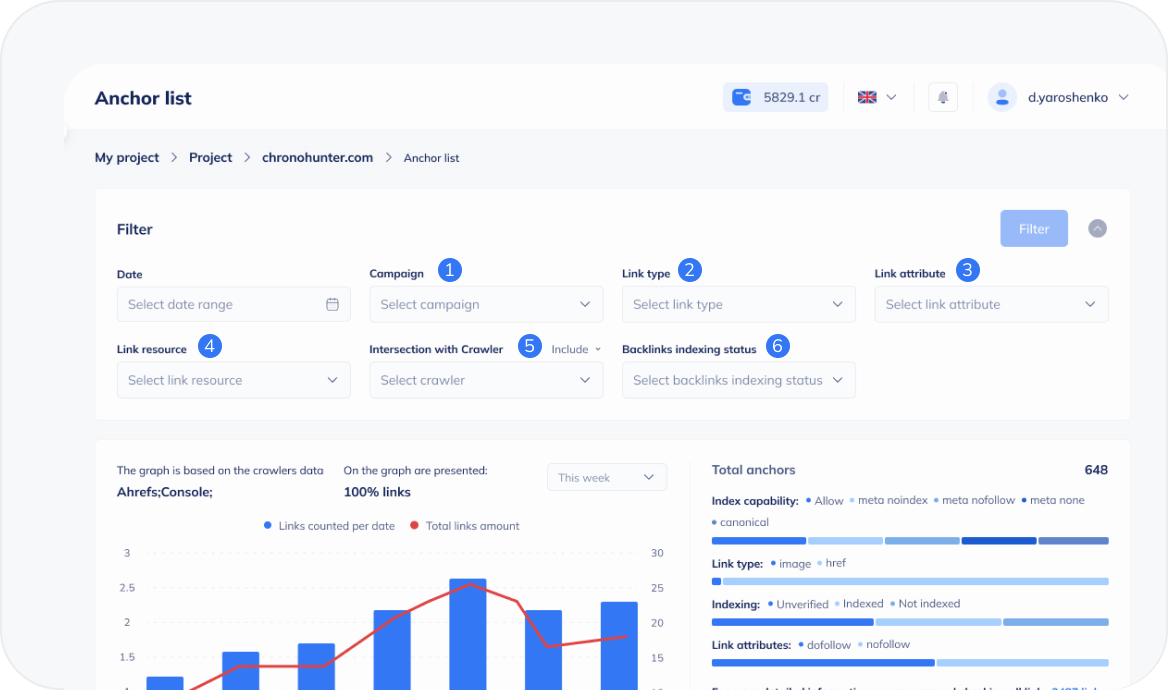 The anchor list chart makes it easy to visualize the distribution of backlinks across various crawlers, helping you assess the naturalness of your website's backlink profile. Additionally, the chart presents several useful ratios: