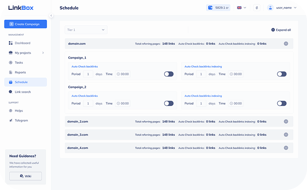 Наш инструмент поиска обратных ссылок упрощает процесс поиска обратных ссылок на ссылающихся страницах, экономя ваше драгоценное время. Используя вкладку «Расписание», вы можете установить интервалы для действия «Проверить ссылку» во всех кампаниях по поиску обратных ссылок в ваших проектах.