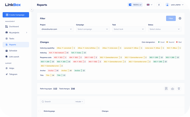 Інструмент аналізу зворотних посилань на нашому сайті надає зручний функціонал звіту про взаємні посилання. Після кожної перевірки він відображає лише зміни, що відбулися з вашими посиланнями, позбавляючи вас від зайвого аналізу стабільних даних. Давайте розглянемо структуру звітів інструменту Linkbox.